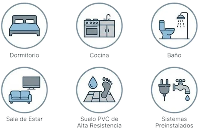 Sí. Cada unidad puede incluir baño completo (ducha, lavabo e inodoro), cocina, instalación eléctrica y sistema de agua listos para conectar. Todo llega montado desde fábrica, reduciendo tiempos y costes.