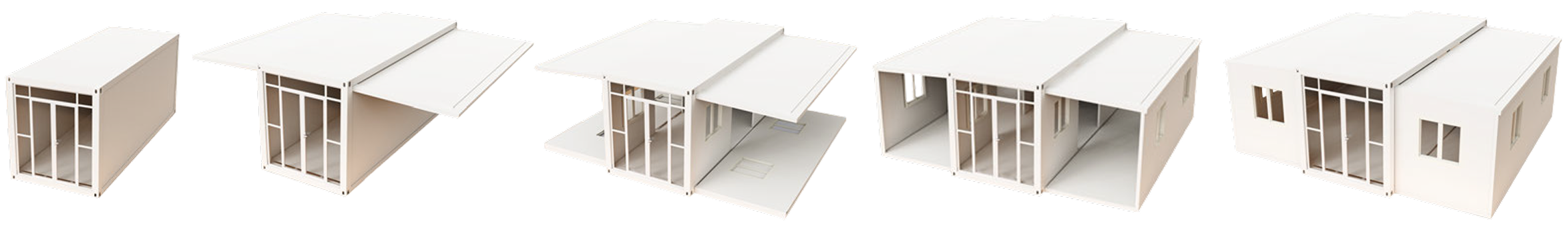 Un promedio de 5 trabajadores puede abrir una casa expandible en 10 minutos. También se puede ensamblar en fábrica y luego trasladarlo a la obra.